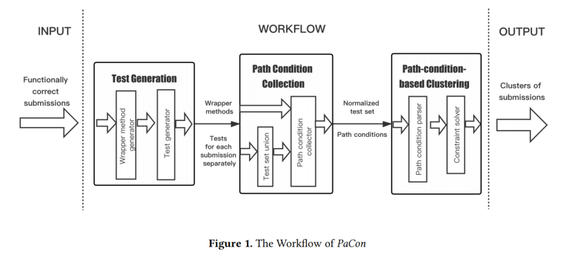 为了帮助识别编程提交中的策略,本文提出了 PaCon,一种对功能正确的编程提交进行聚类的符号分析方法,旨在提供一种识别策略的途径 。PaCon 利用来自符号执行的路径条件来对提交进行聚类。
