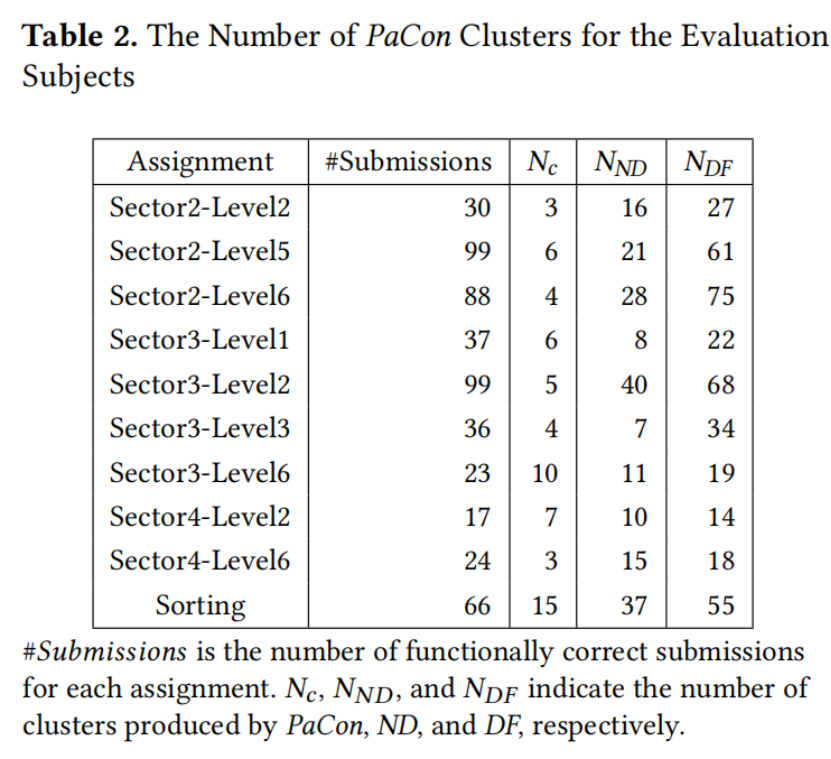 表2 显示了聚类结果的统计数据。前两列指示作业名称和该作业功能正确提交的总数 。PaCon、ND 和 DF 生成的聚类数量分别显示在最后三列 、