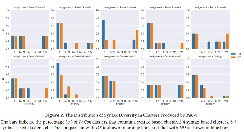 当使用 DF 进行基于语法的聚类时,除两个作业(Sector2-Level5 和 Sector3-Level1)外,所有作业中语法多样性至少为 2的聚类百分比都不低于 40% 。在 Sector2-Level5 中,该比例甚至高达 75% 。相比之下,当使用 ND 进行基于语法的聚类时,对于 Sector2-Level5、Sector2-Level6、Sector3-Level1 和 Sector3-Level6,语法多样性仅为 1的聚类比例超过 60% 。特别是对于 Sector3-Level6,只有 10% 的 PaCon 聚类语法多样性大于 1。