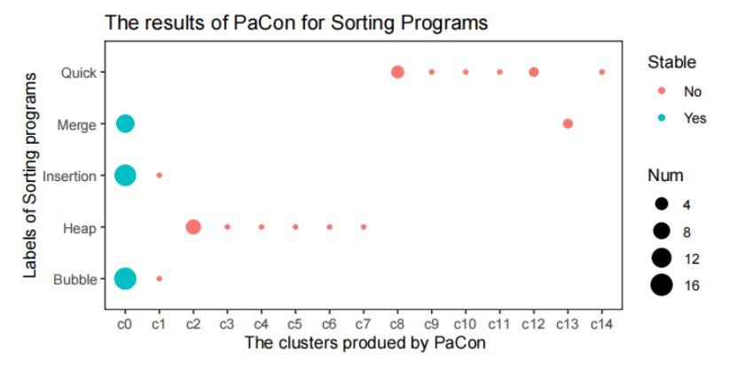 根据图3 显示的结果,PaCon 产生的聚类结果并非识别不同的排序标签,而是反映了排序的稳定性(stability) 。关键定义: 如果数组中任意两个值相等的元素在程序输出中的顺序总是与它们在输入中出现的顺序一致,则该排序程序是稳定的 。具体而言,中的程序都是稳定的排序程序,包括大多数冒泡排序程序、大多数插入排序程序和大多数归并排序程序 。其他 14 个聚类中的程序都是不稳定的排序程序 。