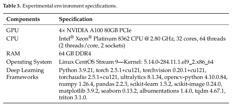- 训练环境:4×NVIDIA A100 GPU,Intel Xeon Platinum 8362 CPU,64GB DDR4,确保大规模数据的训练效率。