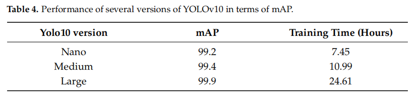 论文测试了 YOLOv10 的 nano、medium、large 三个版本,权衡检测精度与计算效率: