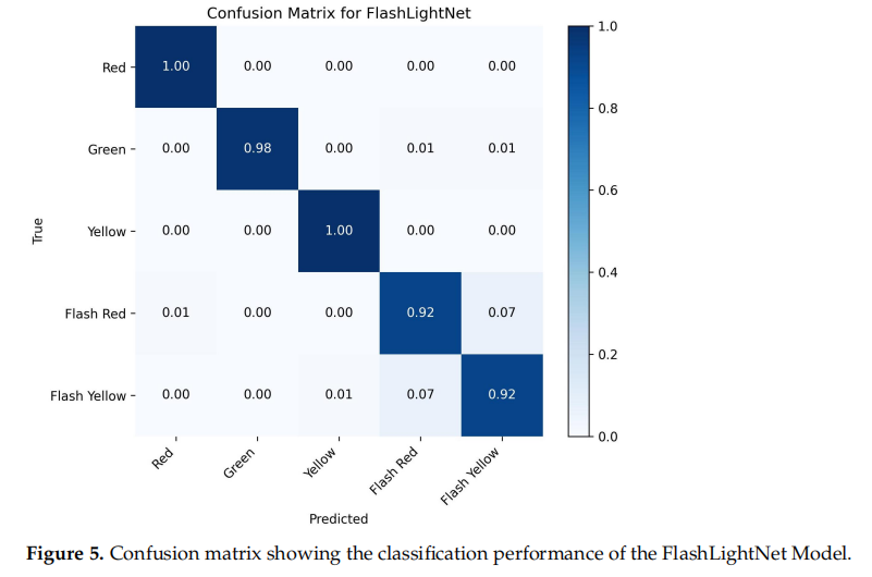 静态灯(红、黄)分类精度达到 100%,绿灯仅 1% 误判;闪烁灯分类精度均为 92%,主要误判源于 "闪红" 与 "闪黄" 的混淆(约 7%),原因是两者的 "亮 - 灭" 时序模式相似,且受环境噪声影响。