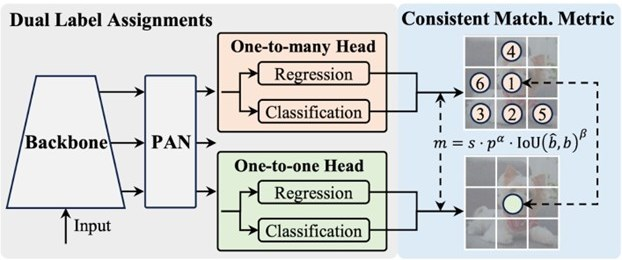 YOLOv10 是单阶段目标检测算法,具有速度快、精度高的特点,其架构包含 Backbone(特征提取)、Neck(特征融合)、One-to-Many Head 和 One-to-One Head(检测输出)四大组件,如图 1 所示: