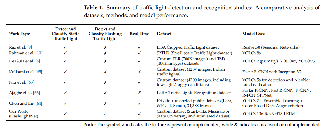 论文对交通灯检测与分类的相关研究进行了系统梳理,明确了现有方法的局限性,为 FlashLightNet 的设计提供了依据。