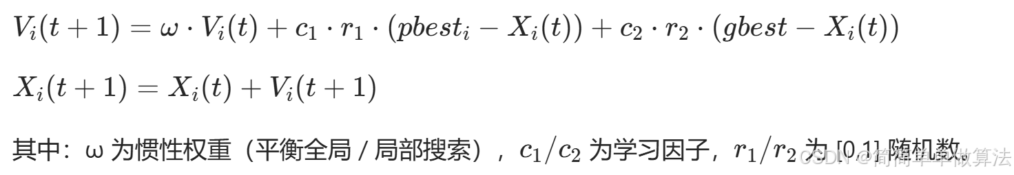 PSO是基于群体智能的优化算法,模拟鸟群觅食行为,通过粒子的"位置"和"速度"迭代寻最优解: