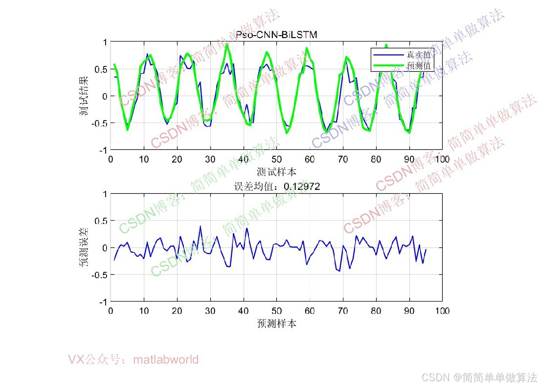 本文提出一种基于PSO优化的CNN-BiLSTM混合神经网络模型,用于多输入单输出回归预测任务。该方法通过PSO优化BiLSTM的隐含层节点数和学习率,以模型训练误差作为适应度函数,经过遗传操作筛选最优超参数组合。算法在Matlab2024b环境下实现,包含完整的训练流程和预测功能,通过对比预测数据与真实数据的误差评估模型性能。
