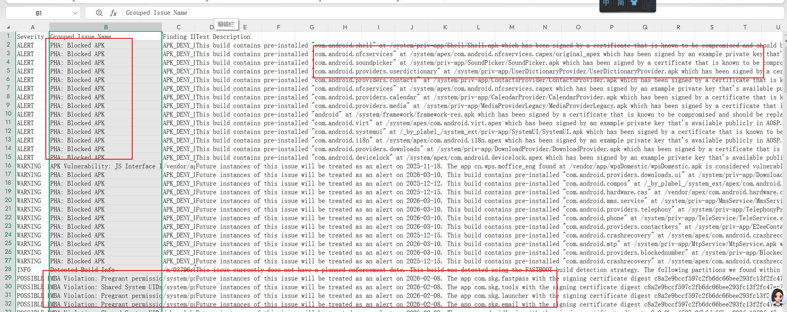 ALERT 主要是和系统签名有关;WARNING 和应用签名有关;POSSIBLE和应用权限有关。