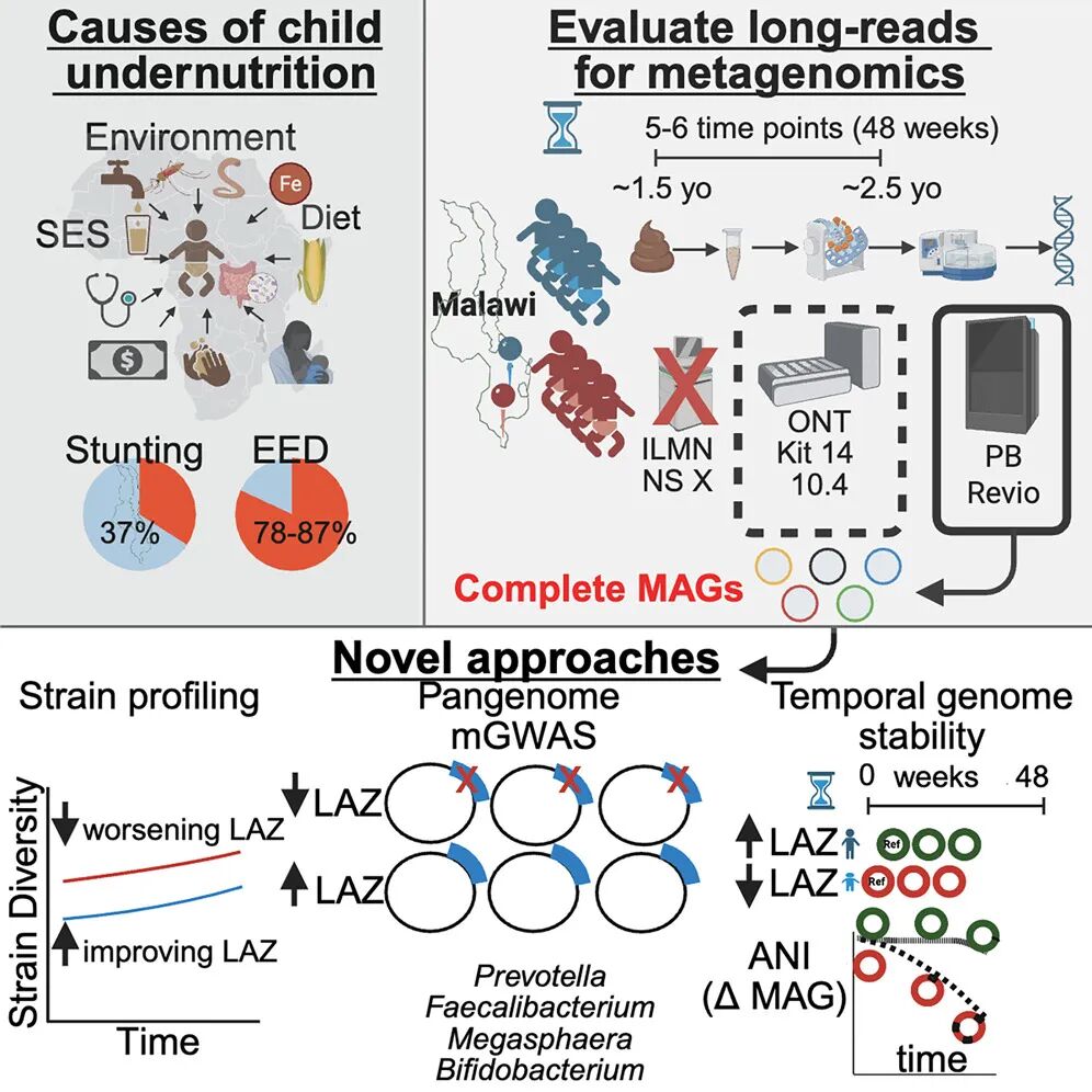 LR宏基因组学终于解锁了从混合样本中大规模恢复完整微生物基因组的能力。我们展示了这一方法如今在大量样本中是可行的,从而使得基于宏基因组样本的宏-泛基因组和mGWAS分析成为可能。结合纵向研究设计,我们展示了微生物进化和基因变化如何与儿童营养不良相关的不同健康轨迹(特别是发育迟缓)相关联。这种新方法将使微生物生态学和进化领域能够提出全新的研究问题,并推动解决全球健康挑战的新发现。我们的研究展示了将LR宏基因组学应用于解决影响全球超过1.5亿儿童的儿童营养不良这一紧迫问题的可行性。值得注意的是,这些相同的方法在大流行监测、传染病诊断(如结核病)和抗生素耐药性监测等方面具有广泛的转化应用潜力。我们的研究结果强调,跨学科的微生物组研究将从cMAGs的生成中获得深远的利益,能够实现高分辨率的比较基因组学、泛基因组分析以及新一代精准分析得以实现。