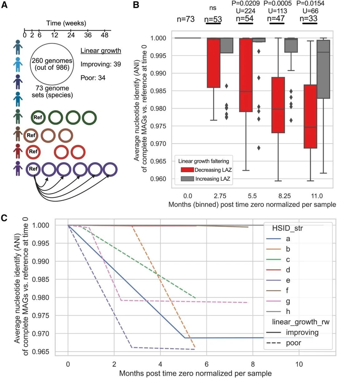 微生物基因组的多样性可以反映环境的稳定性,但完整的基因组数据很少可得。我们测试了基因组稳定性是否与线性生长轨迹相关,假设稳定的环境可以减少微生物的更替,而压力源则会增加微生物的更替。我们的设计使我们能够评估基因组稳定性与LAZ趋势之间的关系。在8名参与者和986个cMAG中,我们发现了260个基因组,其中73个在个体内重复出现(≥3次)(图4A)。这些基因组中,39个出现在LAZ增加的儿童中,34个出现在LAZ下降的儿童中。LAZ下降的儿童在5.5个月(p = 0.02)、8.5个月(p = 0.0005)和11个月(p = 0.0154,U = 66,Mann-Whitney)时表现出更大的微生物ANI差异------即不稳定性(图4B;见Mendeley数据中的表S22)。