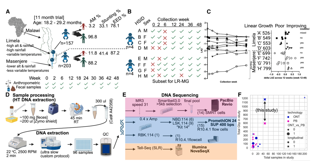 (A) 原始临床试验设计,评估了两个村庄,其中婴儿在最多11个月内进行了测量。每6周采集一次人类学数据(体长、体重和上臂中部围度(MUAC))以确定营养不良状态,最多采集48周。每12周采集一次尿液样本,用于测量环境性肠道功能障碍(EED)。每12周采集一次粪便样本用于微生物组分析。(B) 来自8名参与者(每个村庄4名)的粪便样本子集。每位参与者(n = 8)在不同时间点提供了5到6个粪便样本。(C) 参与者选择代表了LAZ(年龄-身长Z评分)增长或减少的例子。(D) 优化的高通量分子生物学方法,用于粪便样本处理,包括样本保存、DNA提取和质量控制。(E) 测序文库准备概览,以及使用PB(Pacific Biosciences Revio)、ONT(Oxford nanopore Technologies PromethIOn)和ILMn(Illumina novaSeqX)进行的DNA测序。(F) LR宏基因组研究的元分析,展示了我们的研究如何成为一个独特的资源(蓝色 = ONT,品红色 = PacBio;ONT_vs_PB:0 = 研究仅包含一种数据类型,1 = 研究包含使用ONT和PB生成的样本;纵向:0 = 非纵向,1 = 包含每个样本的多个时间点)。另见图S1、S2、S10和S11。