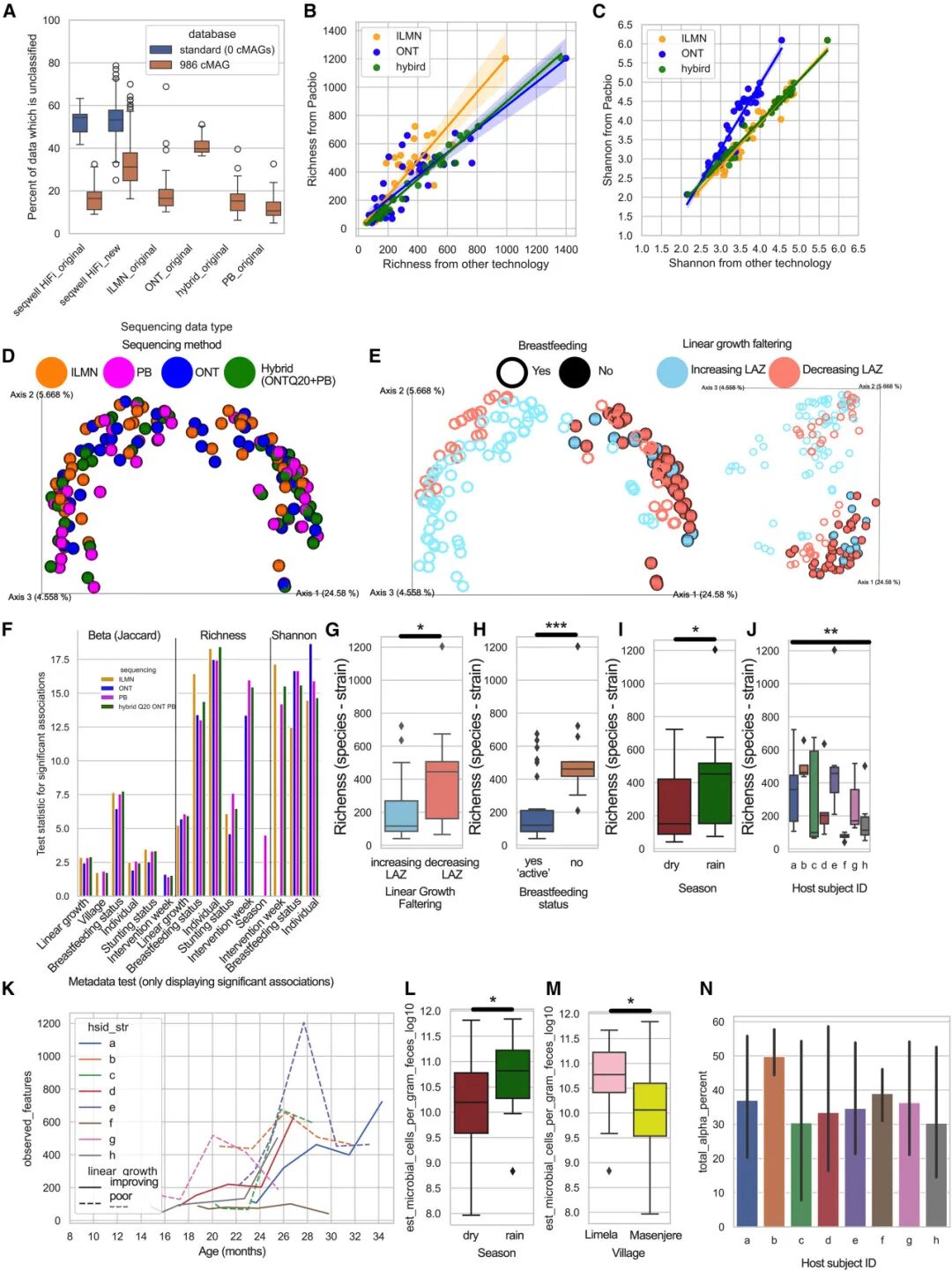 (G--M) 完整的PB HiFi数据(45个样本:B2和C6被排除)在500 Mbp下稀释,展示了与(G)线性生长轨迹、(H)哺乳状态、(I)季节、(J)宿主个体(参与者)和(K)参与者年龄相关的alpha多样性差异,以及(L)季节和(M)村庄之间的微生物生物量差异,并与研究设计参数相关的微生物生物量差异。请注意,alpha多样性是使用Sourmash分类剖析计算的,最低可辨别层次(即菌株或物种)。(N) 单一时间点代表的独特微生物的百分比(一个时间点的丰富度除以所有时间点的独特微生物总数)(平均值,95%置信区间)。