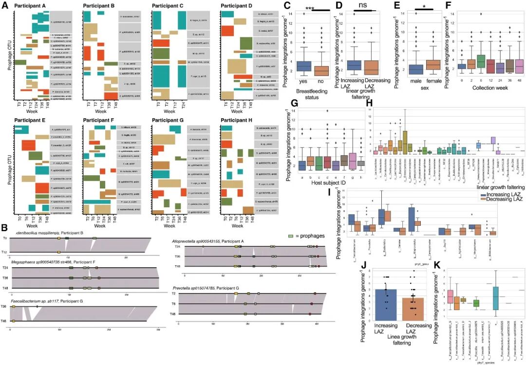 我们评估了在不同二元表型(线性生长、母乳喂养、村庄、季节和性别)下每个环状细菌基因组的噬菌体计数。平均而言,每个基因组有2.93个噬菌体整合(标准差=1.96;范围:0-14)。母乳喂养的儿童噬菌体整合显著更多(p = 0.001,U = 67983),女性的噬菌体计数高于男性(p = 0.012,U = 52653)(图6C--6E;见Mendeley数据中的表S27)。随着LAZ时间点的增加,噬菌体计数趋势较高,但未达到显著性(p = 0.17)。季节或村庄与噬菌体整合没有发现显著关联。噬菌体整合水平在时间和参与者之间保持稳定(图6F和6G),但在细菌目之间有所不同(图6H)。在十大属中,Escherichia(6.93)、Alloprevotella(5.1)和Faecalibacterium(4.16)具有最高的噬菌体计数;而弯曲菌的计数最低(每个基因组1个)(图6I)。在Faecalibacterium中,随着LAZ增加,噬菌体整合较高(p = 0.018,U = 311.5),并且不同物种之间存在差异(图6J和6K)。在肠腔中富集的温和噬菌体,可能对婴儿的屏障功能和免疫防御起到支持作用。