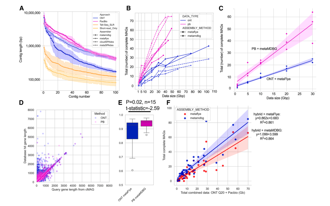 (C) 建立数据输入(Gbp)与生成的(完整)cMAGs之间的模型,分别为每种技术和组装策略组合的最佳表现(ONT-metaFlye vs. PB-metaMDBG)。