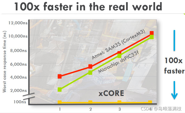 XMOS 独特的 xCORE 体系架构,硬件的 RTOS 运行机制,使它具备很高的执行速度,可以使用多个核来做多个算法,体现出有DSP的运算能力。它可以像 FPGA 那样灵活的配置引脚,通过软件灵活定义硬件外设,而不像 MCU 那样外设已经固定。