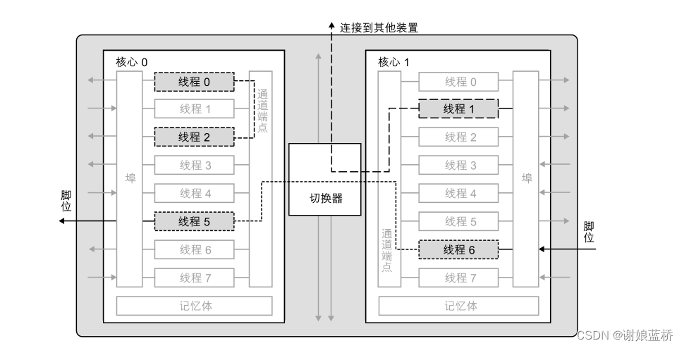 3 多片级联,通过Xconnect, 可将多片独立Xcore连接起来,连起来后可实现I/O, RAM等内部资源共享,且可通过channel进行数据交互。
