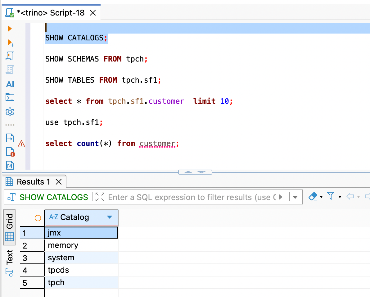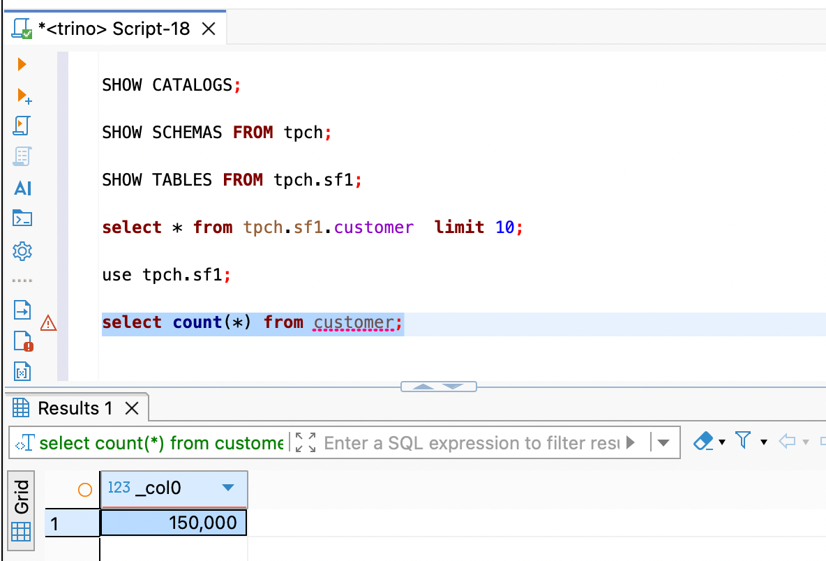 trino> select count(*) from tpch.sf1.nation;