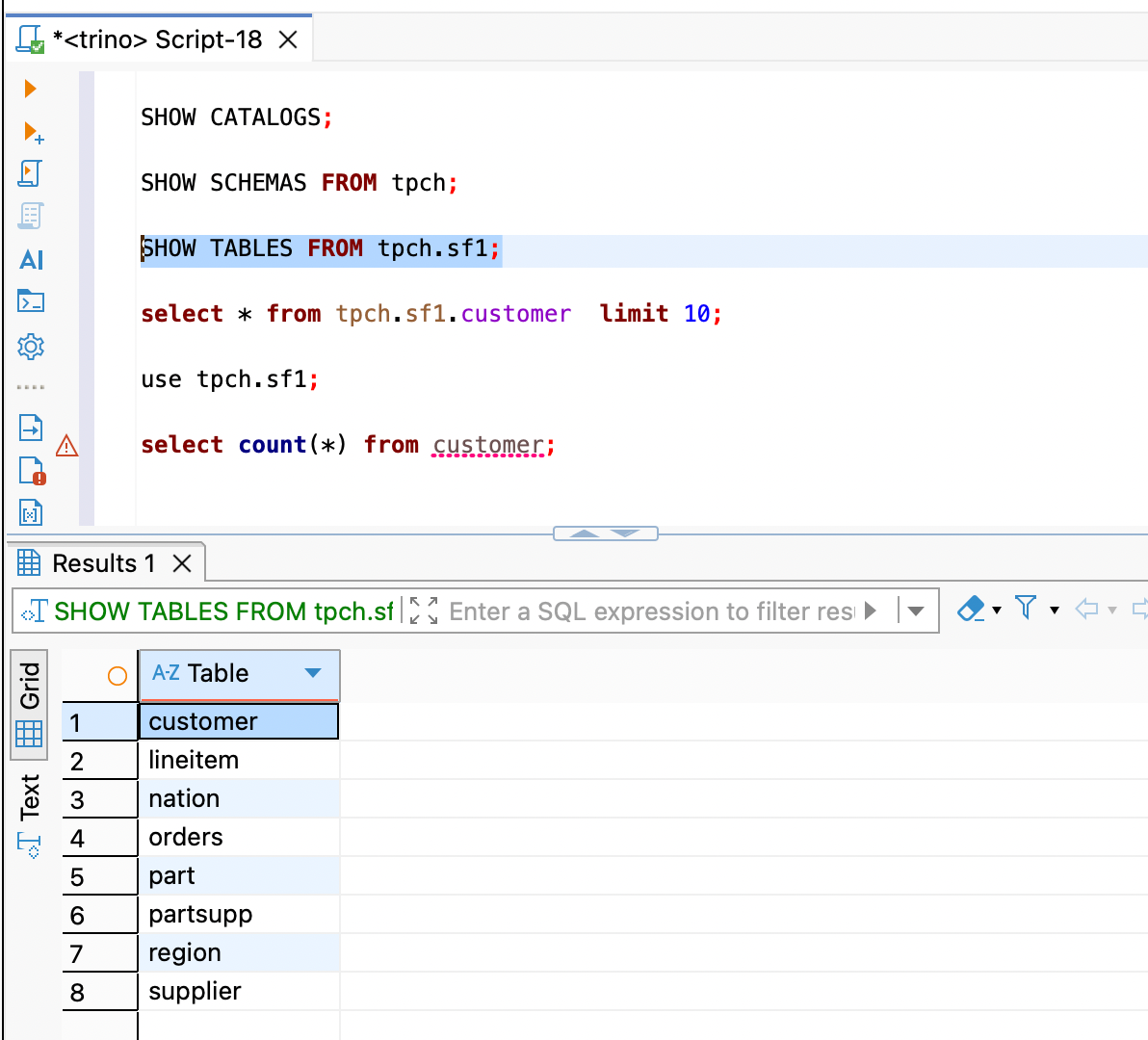 SHOW TABLES FROM tpch.sf1;