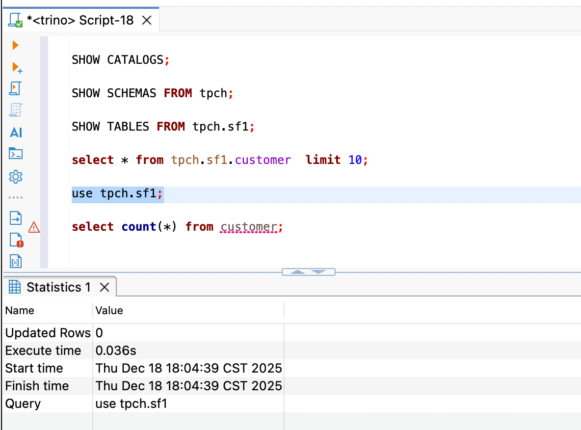 如果你不想每次都写 tpch.sf1.xxx 这么长的前缀,可以使用 USE 命令切换当前环境。