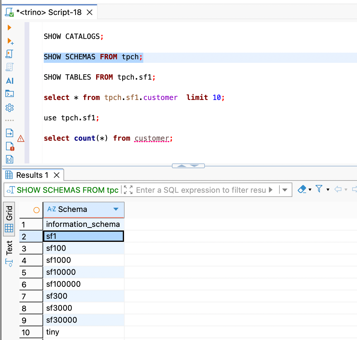 查看 tpch 数据源下有哪些模式(通常 sf1 代表 scale factor 1,即小规模测试集)。