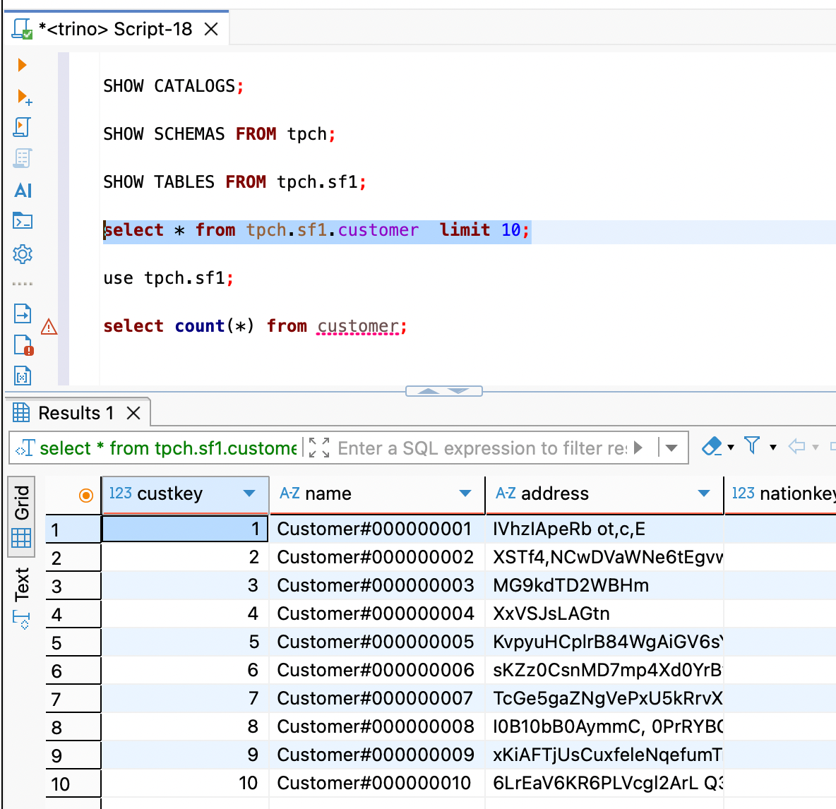 select * from tpch.sf1.customer limit 10;