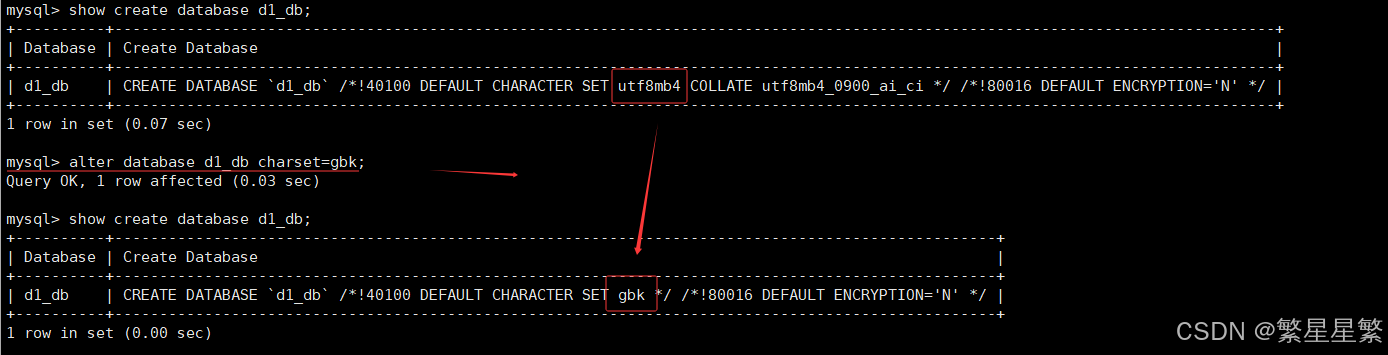 lter database d1_db charset=你想要改变的字符集 collate=校验规则;