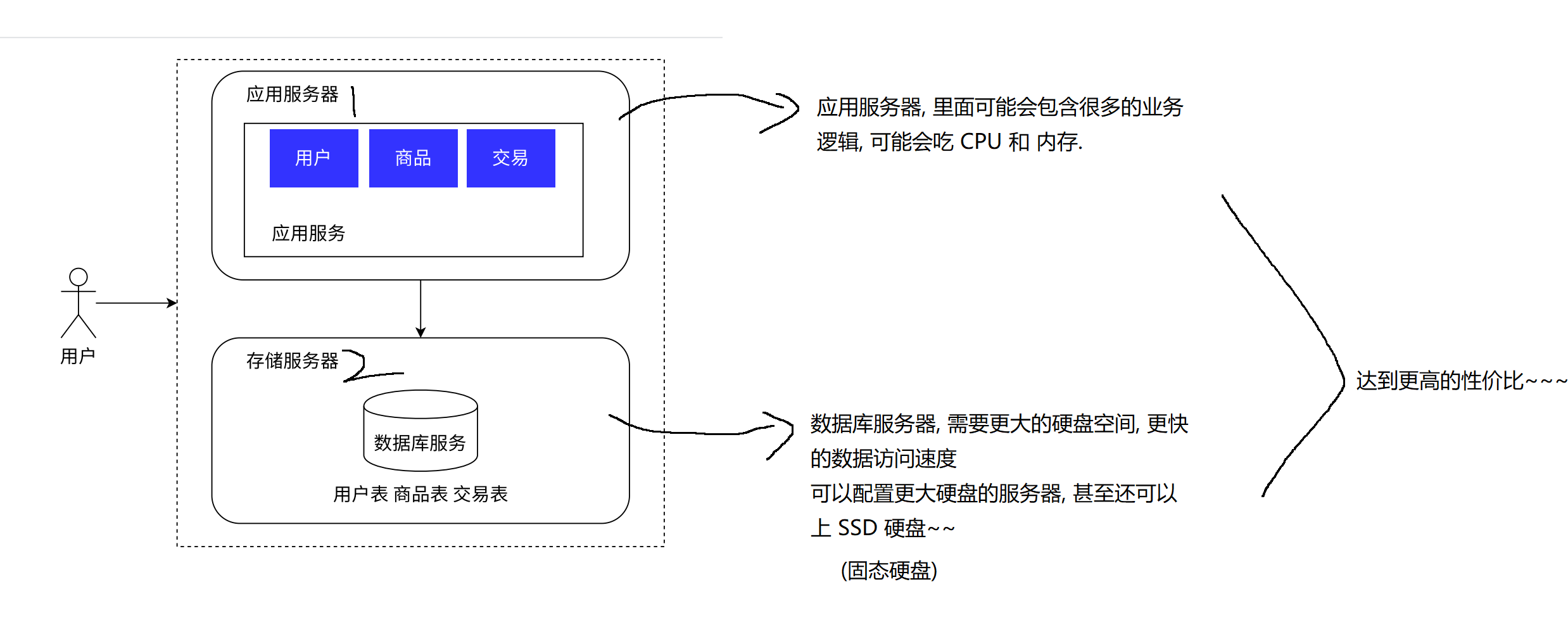 应用服务器和存储服务器分离;就可以对症下药了, 应用服务器需要更多的CPU性能,内存,而存储服务器需要更大的容量,更快的读写速度(从而达到更高的性价比)