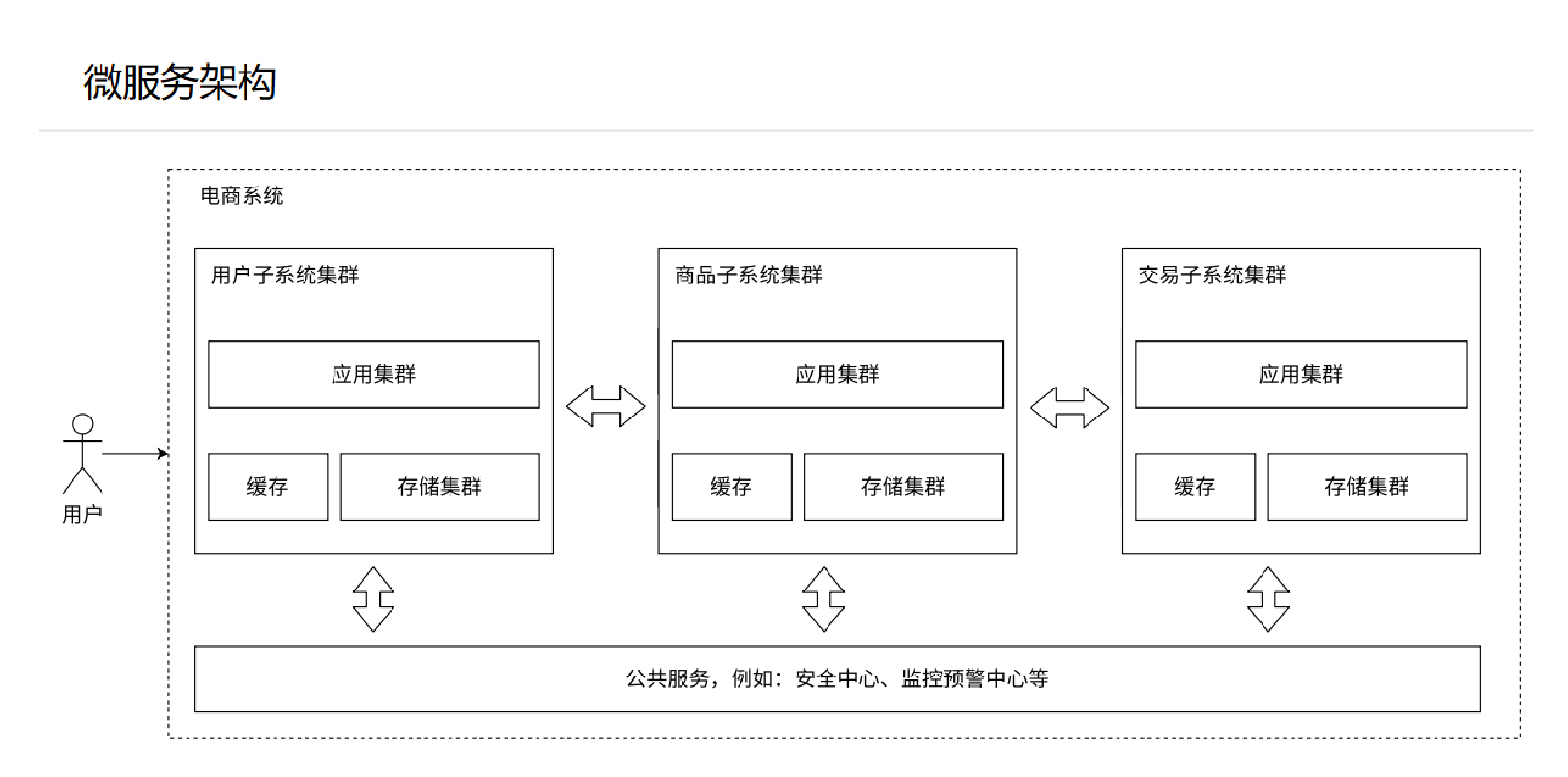 相比于之前的业务全放在服务器们里面跑,**微服务架构是将业务进行更加细致地拆分,每个业务划分成不同的系统集群,**也抽取出一些公共的服务;