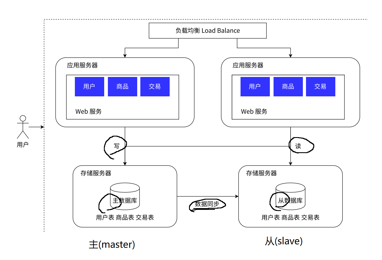 一主多从;从数据库的访问也通过负载均衡的方式进行;主数据库修改数据,同步到从服务器。