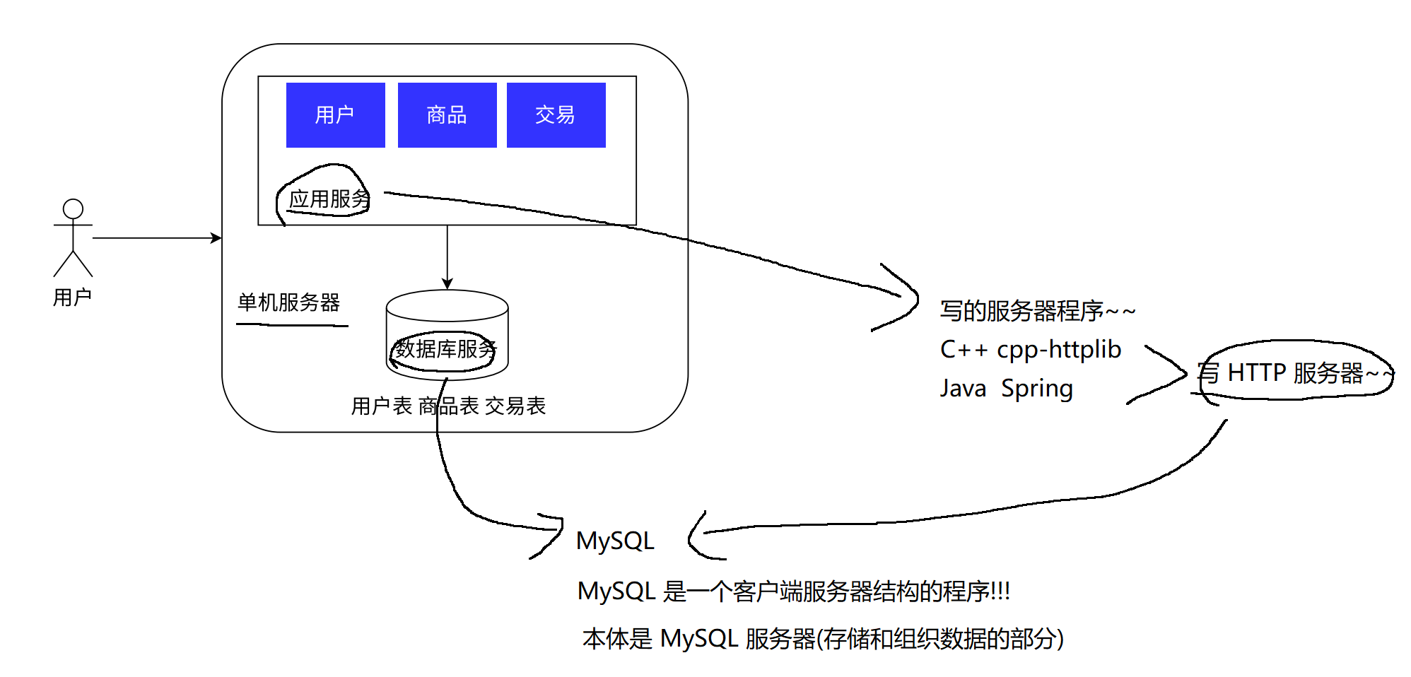 单机架构,应用服务和数据库服务都跑在一台服务器上;