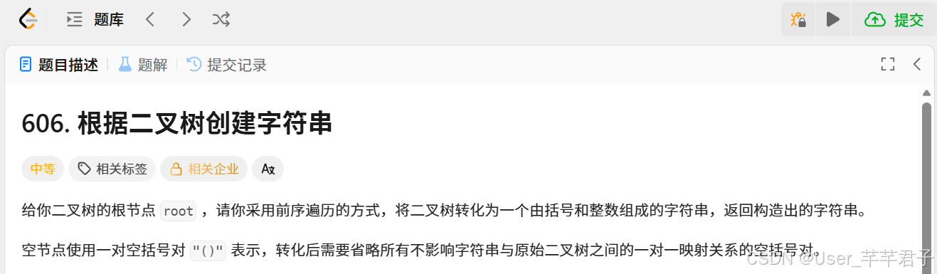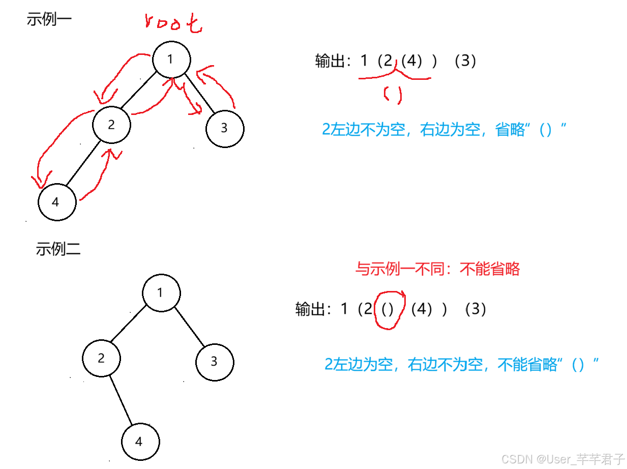 要求将二叉树按照"根节点(左子树)(右子树)"的格式转化为字符串,且有两个关键规则:若左子树为空但右子树非空,需保留左子树的空括号 () ;若右子树为空,可直接省略其括号。