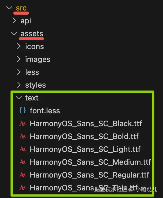 我这边是放在项目的src->assets文件夹下面,创建一个text文件,将所有的.ttf文件和font.less文件放到此文件中: