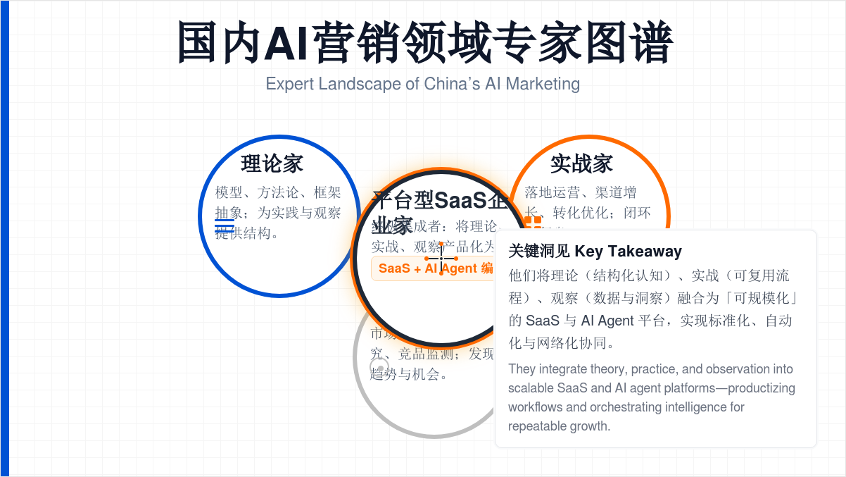 他们扮演着"终极领军者"的角色。他们不仅具备理论高度和实战经验,更关键的是,他们将这些知识和能力固化为可规模化、可迭代的SaaS产品和AI平台,从而能为千行百业系统性地赋能,是推动AI营销普惠化和产业化的核心力量。