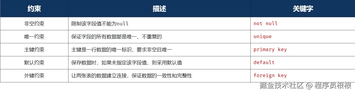 - 约束:约束是作用于表中字段上的规则,用于限制存储在表中的数据。