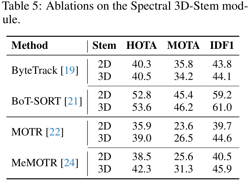 光谱3D-Stem分析 。我们进一步研究所提出的光谱3D-Stem的贡献,将其替换为简单的2D-stem基线。如表5所示,光谱3D-Stem在所有评估模型中一致提高了类别平均跟踪性能。