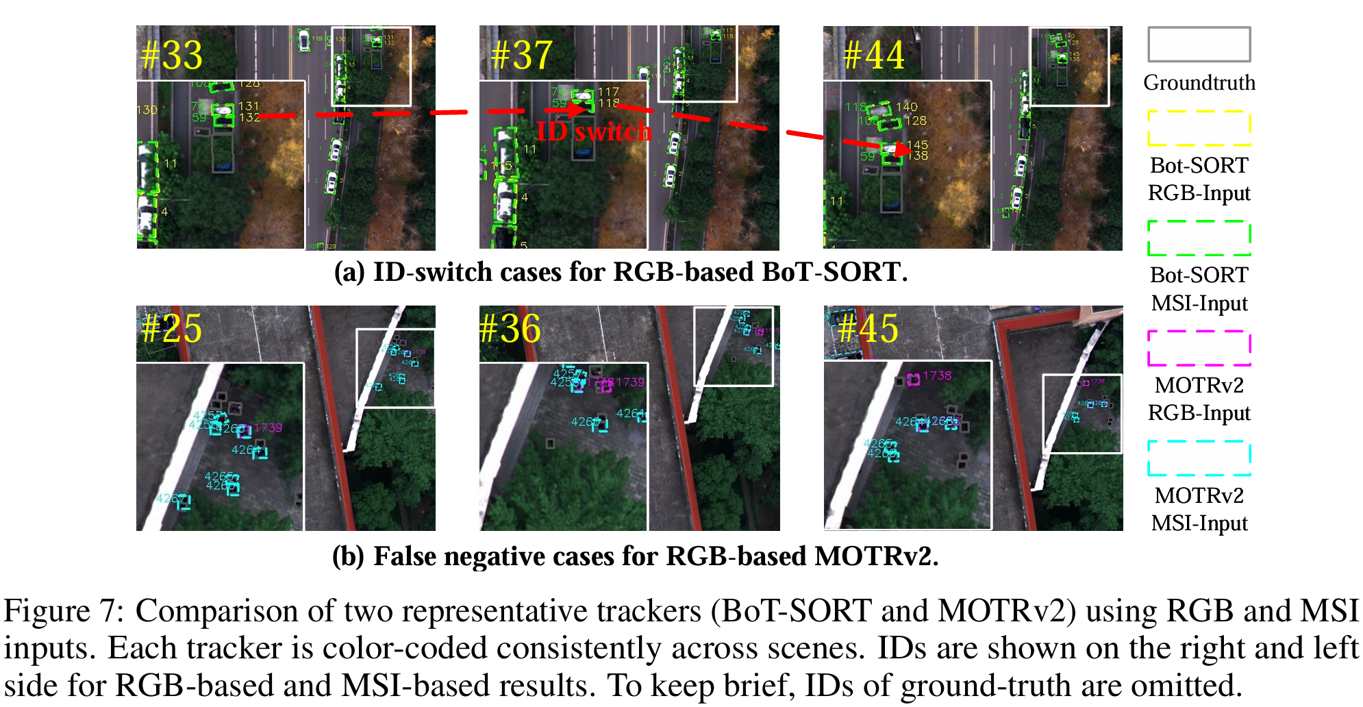 RGB和MSI输入的定性比较 。如图7所示,多光谱输入在视觉上具有挑战性的条件下带来改进的跟踪性能。在上排,使用RGB输入的BoT-SORT(黄色框)在密集人群场景中对自行车目标表现出多个ID切换和漏检。在底排,使用MSI输入的MOTRv2(青色框)比其RGB对应物(粉色框)表现出更稳定的身份关联和更好的召回率,特别是在跟踪多个小尺寸、低分辨率的行人实例时。尽管两种模型在极小目标下都无法实现完美跟踪,但MSI版本检测并保持了显著更多的正确轨迹,这得益于人类目标的光谱可分离性。这些定性观察并非孤立案例,而是在整个数据集中观察到的代表性模式。它们证明多光谱输入有效缓解了身份切换,减少了错误检测,并在具有挑战性的条件下增强了整体跟踪鲁棒性。