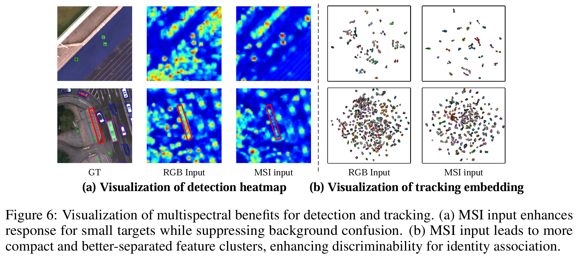 另一方面,图6通过检测热图和跟踪嵌入直观地展示了多光谱输入带来的优势。在上排(左面板),MSI输入产生更清晰、更聚焦的热图,精确定位真实目标,而基于RGB的响应常常因背景杂乱而扩散或抑制。此外,在底排,MSI有效抑制了视觉上相似的干扰物或杂乱区域的错误激活,这些在RGB域中仍然显著。对于跟踪嵌入(右面板),我们通过降维可视化身份嵌入,其中每种颜色和标记表示不同ID。与RGB相比,MSI输入产生更紧凑、明显分离的簇,反映了改进的特征可区分性和减少的身份歧义。总体而言,这些可视化突显了光谱线索如何在复杂空中条件下为检测和关联提供有价值的补充信息。