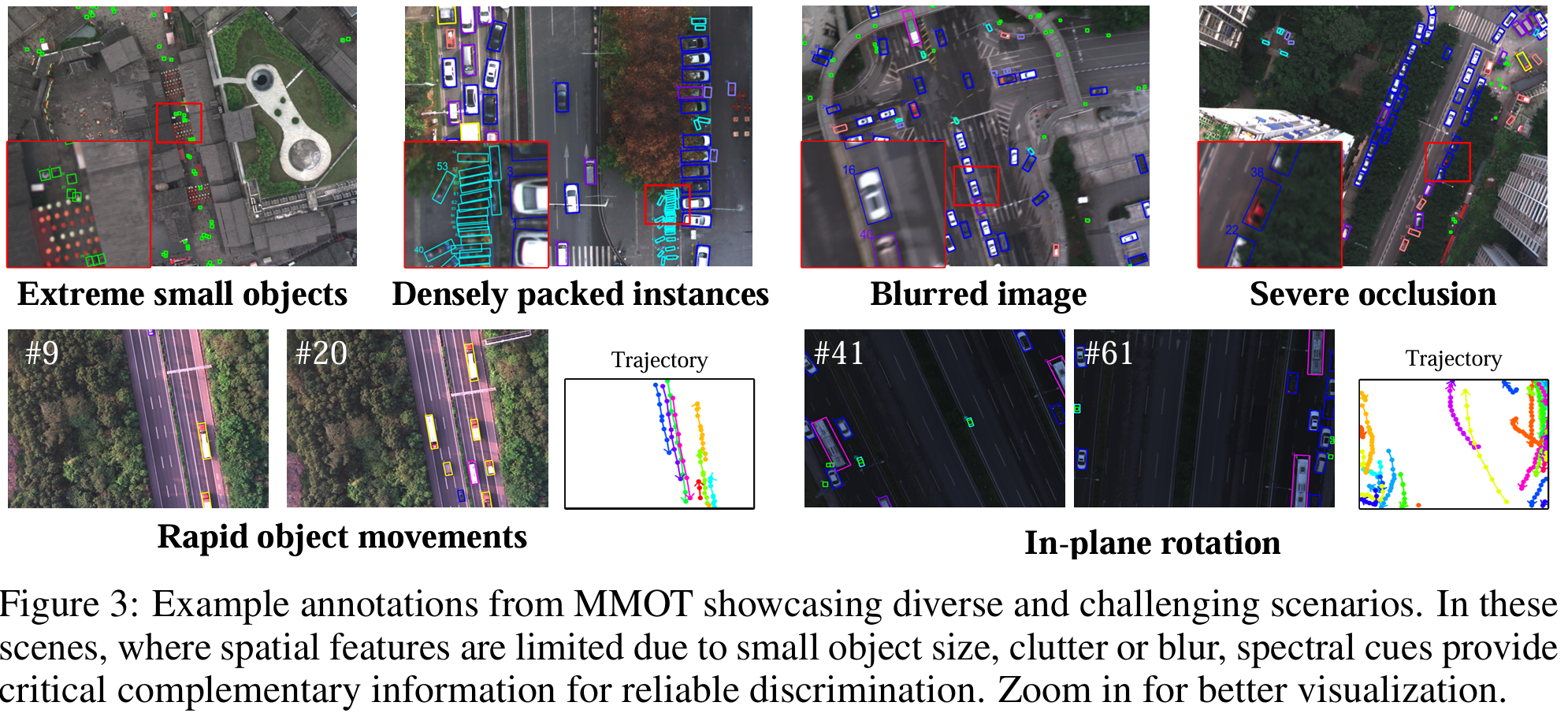 为弥合这一差距,本工作提出了MMOT,首个大规模、具有挑战性的多光谱无人机MOT数据集。该数据集使用向下视角的无人机多光谱相机收集,捕捉了不同日期、飞行高度和天气条件下的真实城市场景。该数据集具有三个关键特性: