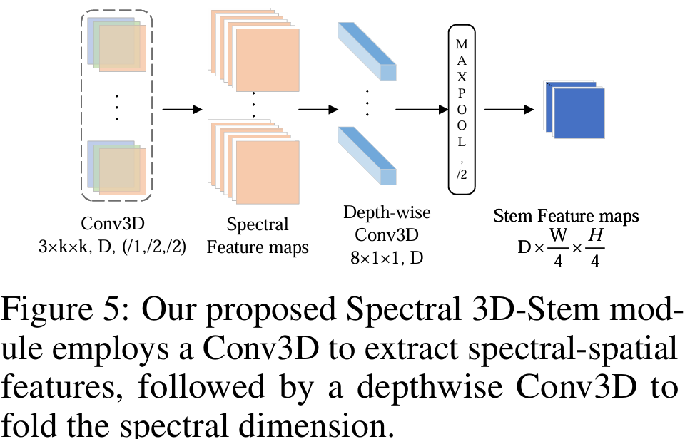 通过光谱3D-Stem进行光谱-空间特征编码。我们提出了一种轻量但有效的光谱3D-Stem模块,用于联合光谱-空间特征提取。如图5所示,一个具有光谱核大小为3的3D卷积沿光谱轴滑动,以捕获局部光谱变化,并生成八组特征图,每组对应特定光谱波段。随后,另一个具有光谱核大小为8的3D卷积在整个光谱范围内聚合信息,同时保留学习到的空间语义。