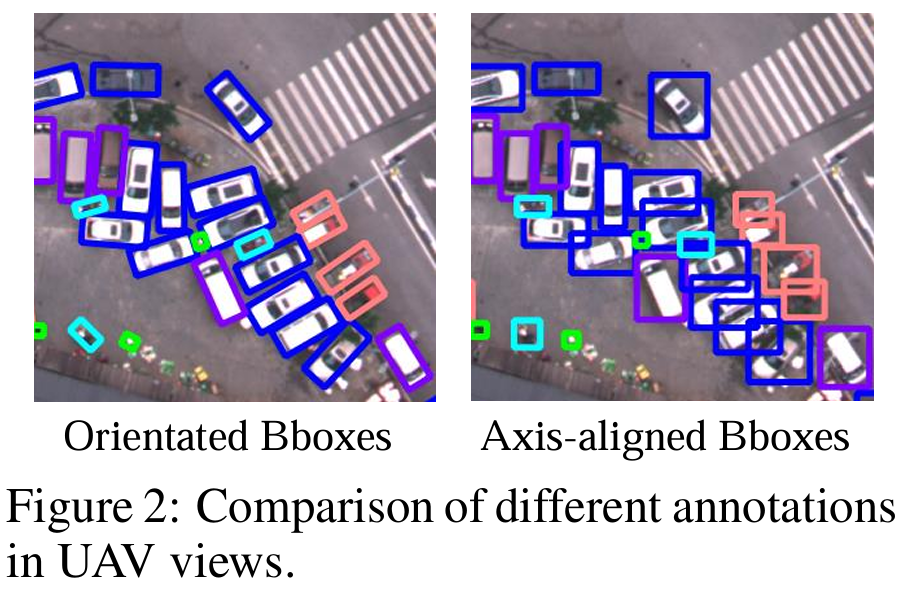 用于无人机视角的OBB标注 :为了解决空间失真并减少帧间和目标间歧义,如图2所示,我们采用OBBs,它们更好地符合目标几何形状,减少目标间误差,提高定位精度和目标关联性能。