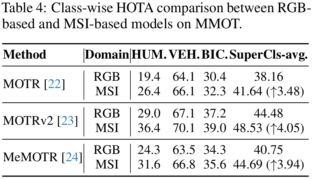 多光谱线索的优势 。为进一步量化多光谱输入的优势(超出整体性能),我们在RGB和MSI域中比较相同跟踪算法在不同超类上的表现。如表4所示,所有评估模型在利用多光谱图像时,在超类平均HOTA分数上都表现出一致的提升,突显了光谱线索的有效性。性能改进在HUMAN类别中尤为突出,该类别具有众多小尺寸、低纹理和密集分布的实例。具体来说,MOTR在HOTA上提高了+7.0,MOTRv2+7.0,MeMOTR+7.3。这些结果强调了光谱线索在空间分辨率退化的挑战条件下增强可区分性的价值。