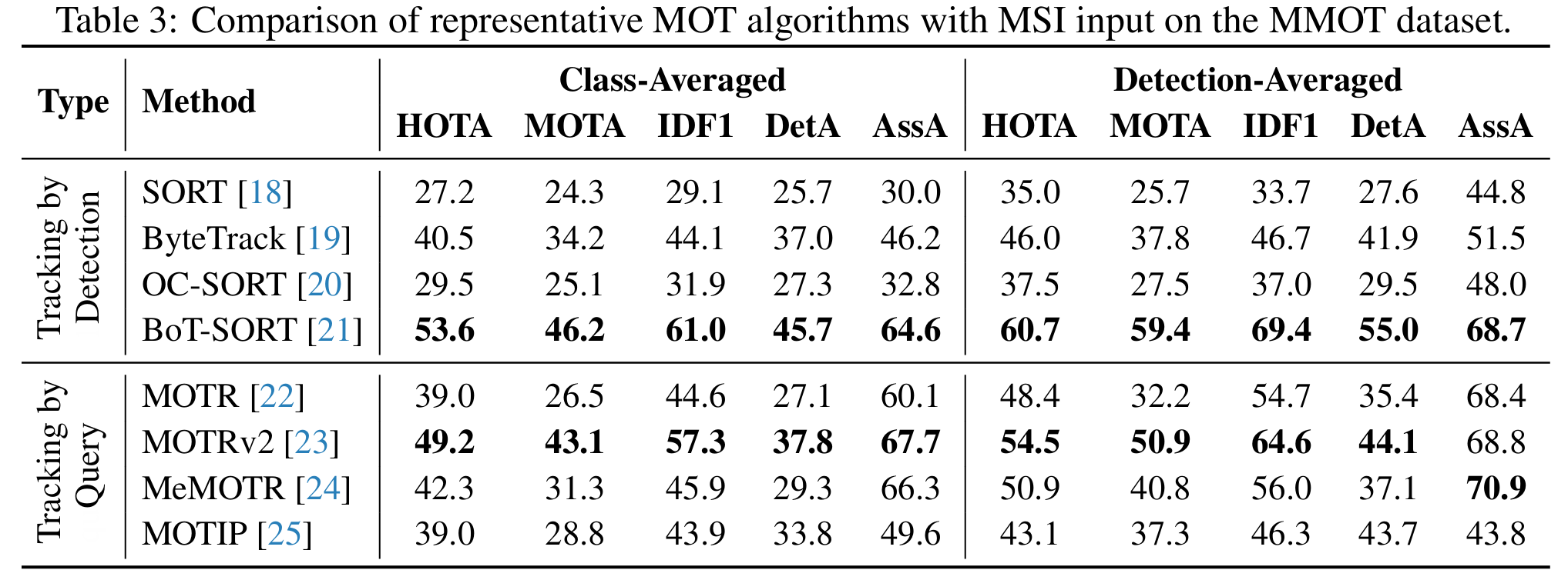 基于MSI的整体性能。所有方法都在全面和公平的条件下进行评估,详细结果如表4所示。在所有评估的跟踪器中,BoT-SORT实现了最佳整体性能,达到类别平均度量53.6 HOTA、46.2 MOTA和61.0 IDF1,以及检测平均度量60.7 HOTA、59.4 MOTA和69.4 IDF1。这种优越性能很大程度上得益于YOLOv11生成的高质量检测提案和BoT-SORT中的鲁棒光流模块,该模块有效考虑了相机运动。