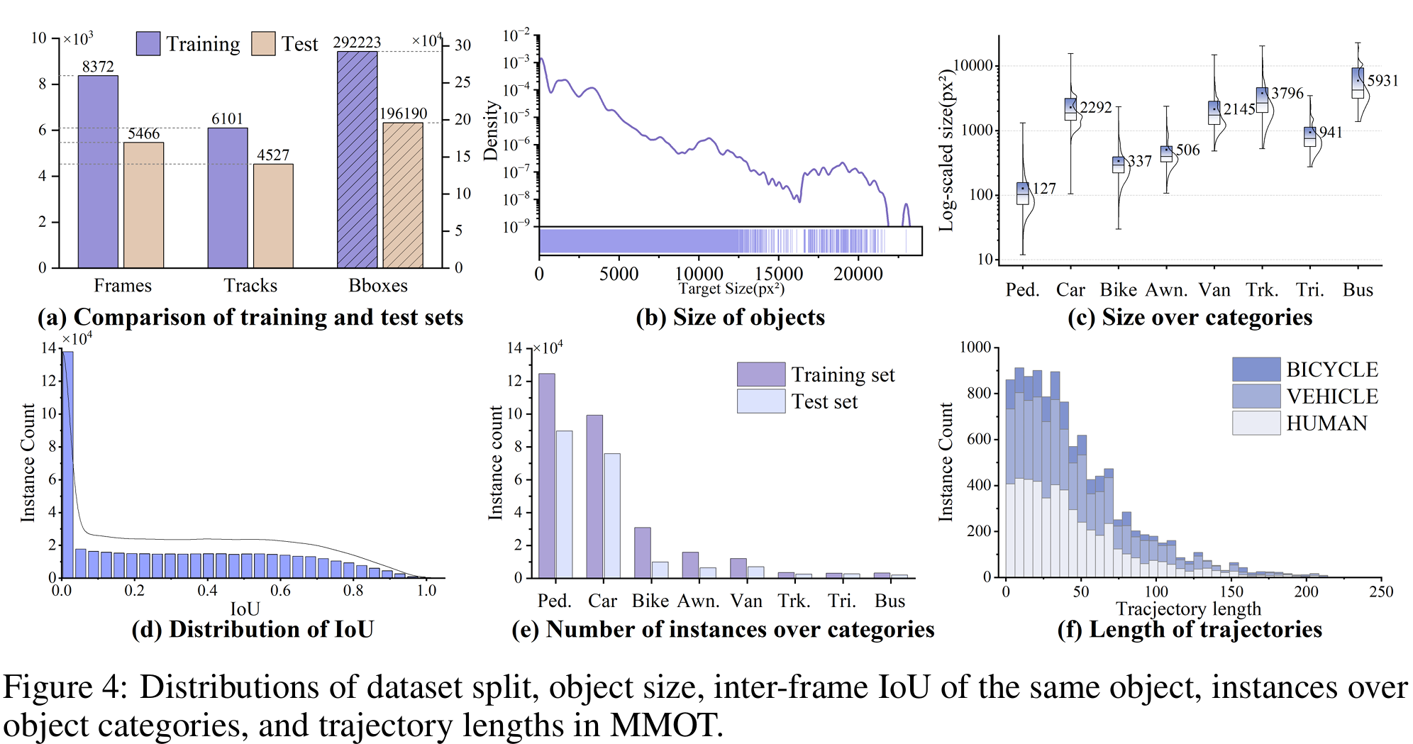 尺寸和密度挑战 。如图4(b)所示,小目标主导整体分布,突显了微小目标的普遍性。此外,如图4©所示,所有类别都显示出目标尺寸的广泛差异,这反映了UAV飞行高度和地面采样距离在数据采集过程中的可变性。除了目标尺寸,表2将MMOT与现有基于UAV的MOT基准在空间密度和运动复杂性方面进行了比较。MMOT实现了最高的目标密度,每帧最多155个目标,平均在300像素半径内有19.4个目标,超过了VisDrone-MOT(147, 14.7)和UAVDT-MOT(82, 18.0)。这些结果强调了MMOT的固有难度:微小、低分辨率目标占主导地位,加上高度可变和局部集中的密度,限制了纯空间特征的有效性。