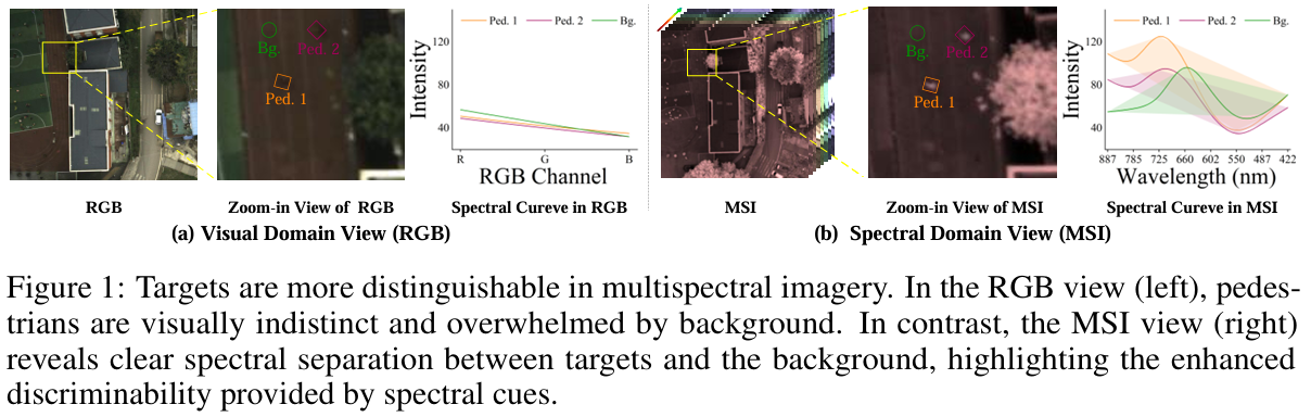 多光谱成像(MSI)捕获空间和光谱线索,实现像素级光谱测量,揭示超出视觉外观的目标特性,提供比RGB更丰富的场景表示。光谱维度提供了补充线索,改善了目标区分和关联,特别是在小目标和复杂背景条件下。如图1所示,由于尺寸小和颜色相似,行人在RGB中在视觉上与背景难以区分。相比之下,MSI揭示了明显的光谱差异,如不同的光谱曲线所证实的,从而提高了目标-背景的可分离性。因此,与传统的RGB图像相比,多光谱数据通过引入互补且具有区分性的光谱维度,为目标跟踪提供了更有效的解决方案。然而,缺乏专门针对无人机多光谱多目标跟踪的数据集是一个重大空白,限制了这一新兴领域中先进方法的开发和评估。