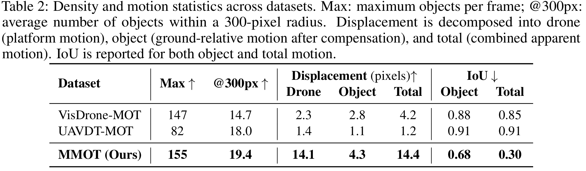帧间位移和重叠分析 。帧间目标动态表示一个关键特征,因为许多MOT算法严重依赖一致的运动模式来维持身份关联。在无人机到地面的场景中,每个目标的表观运动来自两个耦合源:无人机平台的自我运动和目标本身的内在运动。如表2详细所示,我们通过KLT光流[17]估计平台运动,并将其与目标运动解耦,以独立评估这两个组成部分。与VisDrone-MOT(无人机/目标/总位移为2.3/2.8/4.2像素)和UAVDT-MOT(1.4/1.1/1.2像素)相比,MMOT表现出明显更大的动态性,平均无人机、目标和总位移幅度分别为14.1、4.3和14.4像素。这种强烈的表观运动伴随着明显较低的帧间IoU,目标运动平均为0.68,总运动仅为0.30---远低于先前数据集中观察到的0.9范围。图4(d)中的IoU分布进一步支持这一发现,显示大多数目标保持低于0.1的重叠,这在传统MOT场景中很少见。这些结果突显了仅使用运动线索实现可靠帧间关联的难度,因为小目标尺寸、强烈的自我运动和快速局部运动的综合效应严重破坏了帧间的空间连续性。