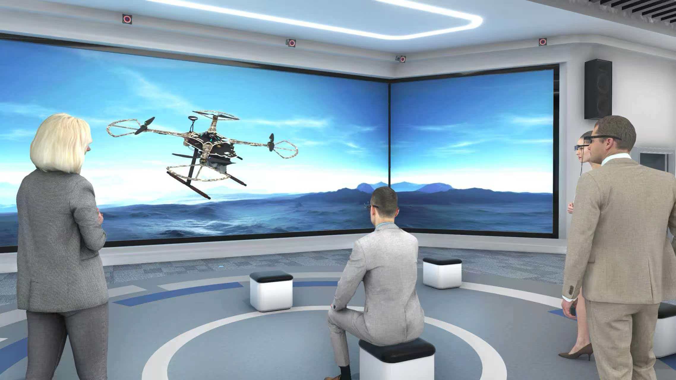 恒点无人机测绘"AI+虚仿"创新实训室,以虚拟仿真教学管理平台为核心,整合3D-LED大屏交互系统、XR数字工作站、MR多人协同系统、CAVE沉浸式场景等智能硬件,构建了"认知---训练---协同---实战"四层实训体系。