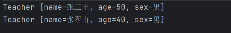 return "Teacher [name=" + name + ", age=" + age + ", sex=" + sex + "]";