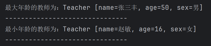 System.out.println("最小年龄的教师为:"+minAgeTeacher);