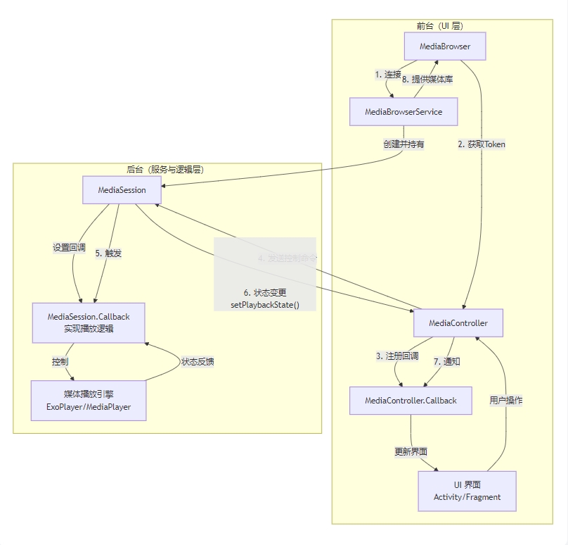 - 浏览内容 (可选): UI 可以使用 MediaBrowser.subscribe() 请求媒体内容结构(如显示歌曲列表)。