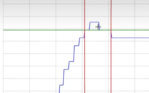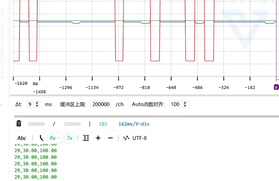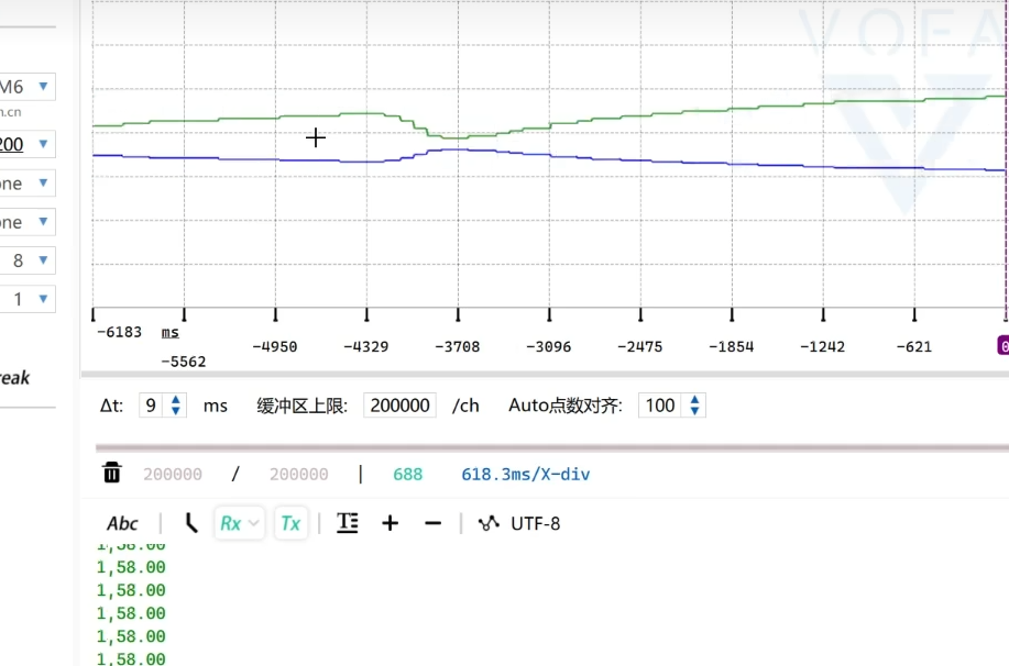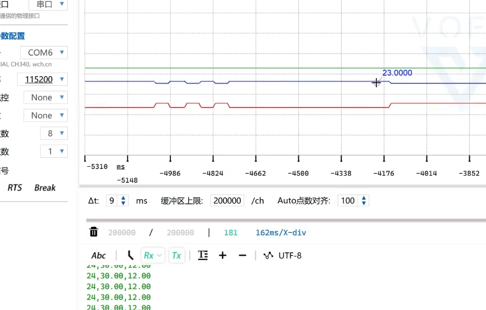 之后蓝色的是目前的速度,绿色是目标值,可以看到目前是23没有达到目标值是因因为PID补偿太小了。